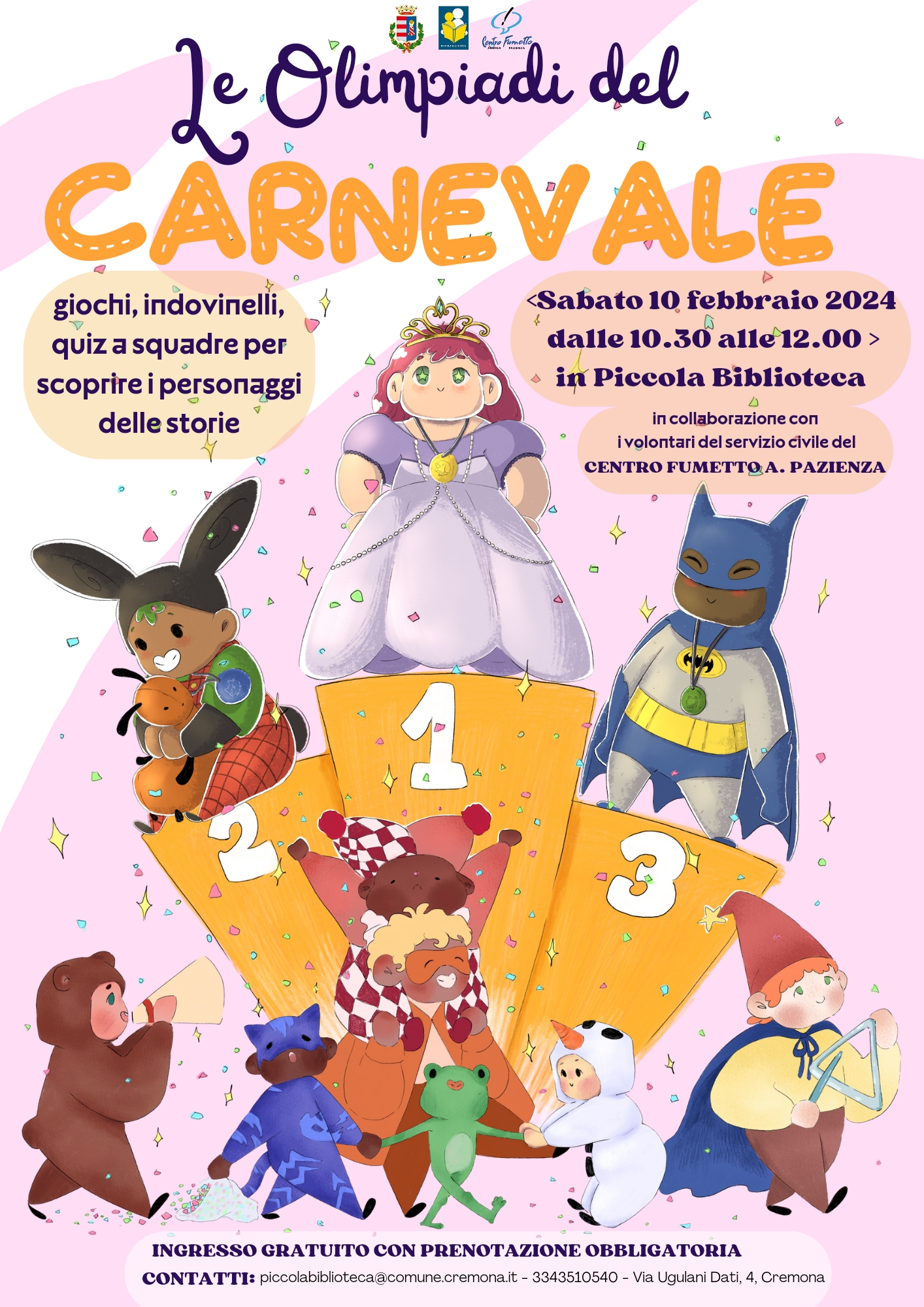 la Piccola Biblioteca e Il Centro Fumetto Andrea Pazienza organizzano Le Olimpiadi del Carnevale: quiz e giochi a squadre per scoprire i personaggi delle storie.