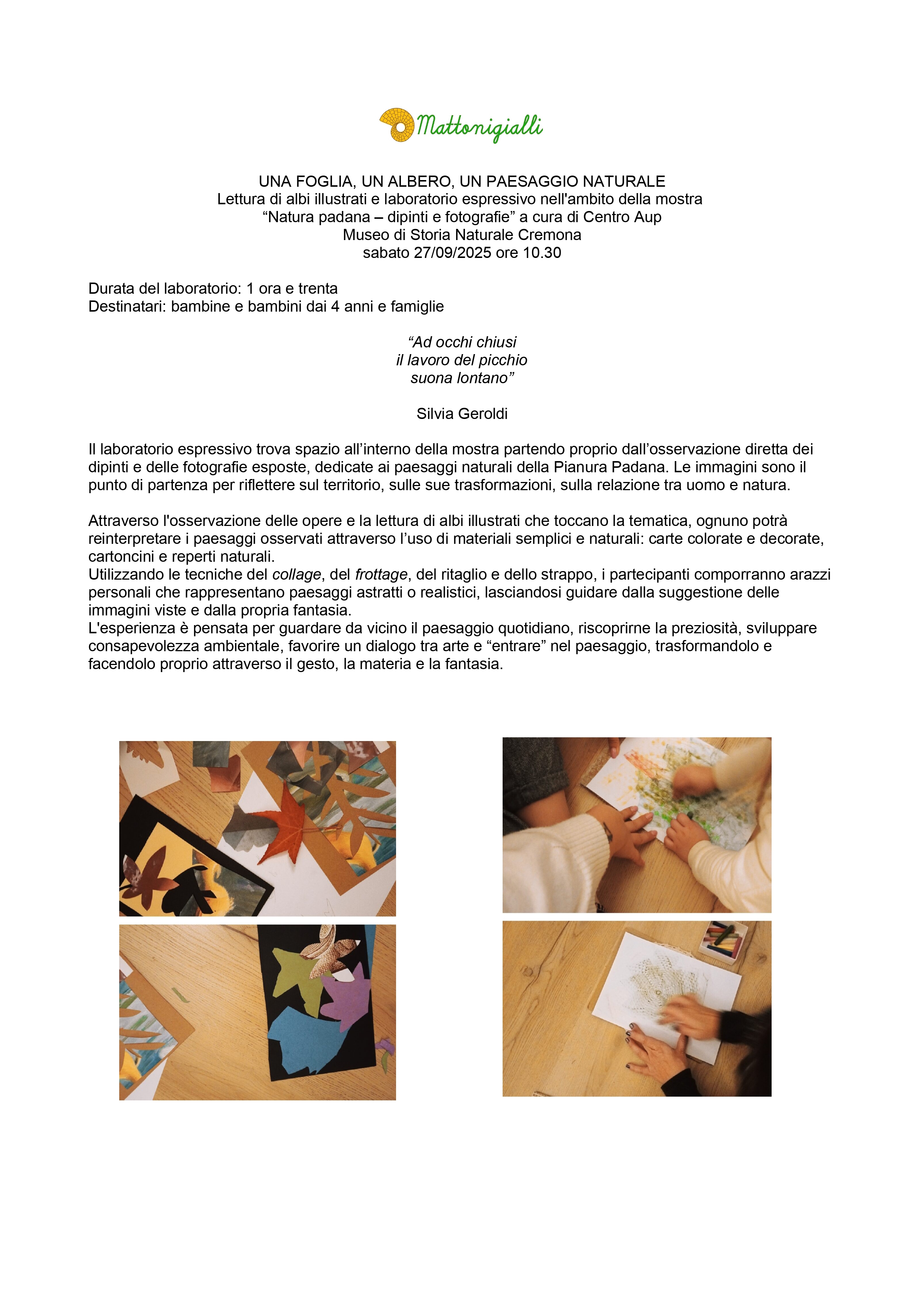 Il laboratorio, partendo dall'osservazione della mostra, porterà ad una riflessione sul territorio e la sua trasformazione, sulla relazione tra uomo e natura.